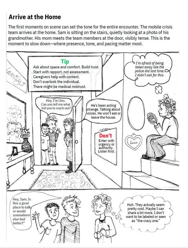 A scenario-based, illustrative resource that brings mobile crisis response to life through a real-time story, emphasizing trust-building, cultural responsiveness, and person-centered care.