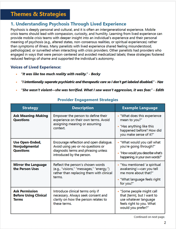 A practical, action-oriented handout informed by four lived-experience webinars featuring individuals, family members, and peer providers. The resource offers actionable insights to enhance team training and day-to-day practice.