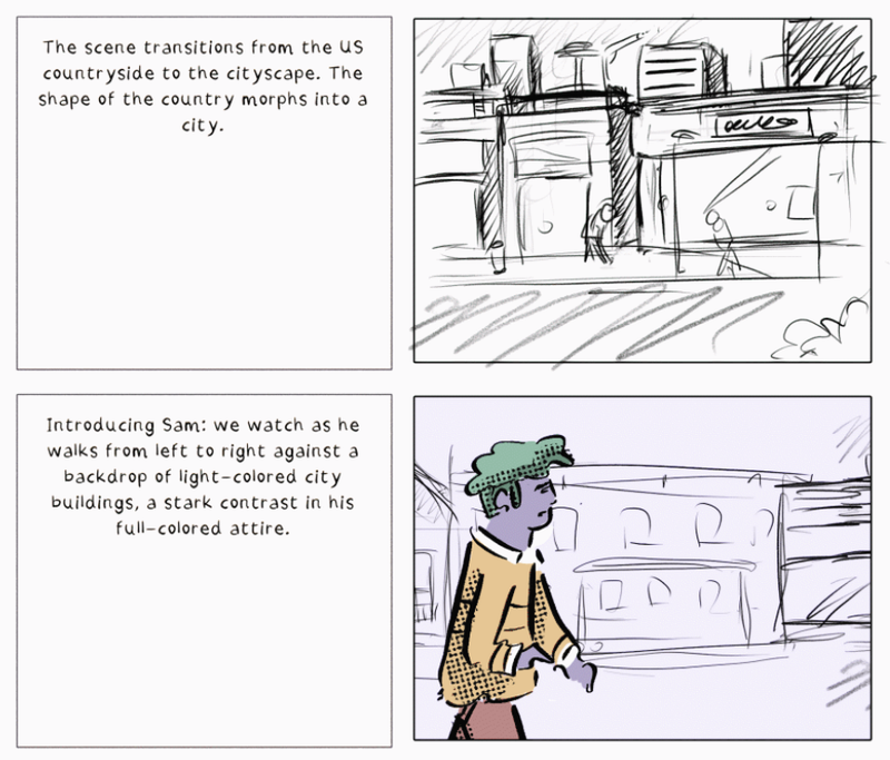 Here’s an example of a scene from start to finish – from rough mockup to color palette and final illustration.